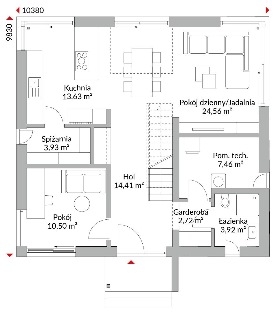 Dom półtorapiętrowy z zadaszeniem nad wyższymi drzwiami wejściowymi i trzema pokojami na piętrze. Główna sypialnia z garderobą typu walk-in i prywatną łazienką z wanną, prysznicem i podwójną umywalką. Przestronny hol z jasnym kącikiem do czytania. Drugie WC z prysznicem na piętrze. Przeszklenia do podłogi z balkonami francuskimi. Osobny pokój wielofunkcyjny z narożnym oknem na parterze. Podwyższony parter z dużym przeszkleniem narożnym tworzy otwartą przestrzeń: kuchnię, salon i jadalnię z wyjściem na taras. Spiżarnia, pomieszczenie techniczne, wiatrołap z miejscem na garderobę, WC dla gości z prysznicem. Dach dwuspadowy, okap 60 cm, nachylenie 40°, ścianka kolankowa 1,25 m.