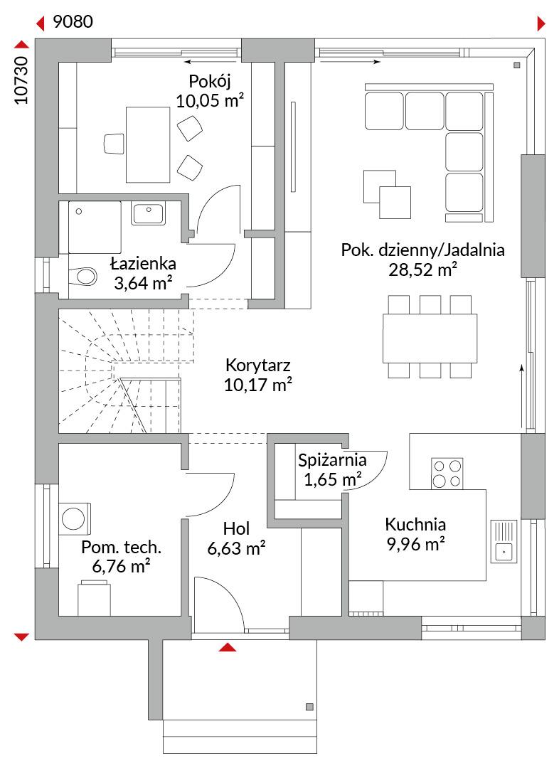 Dom półtorapiętrowy z zadaszeniem wejścia do wyższych drzwi wejściowych i trzema pokojami na piętrze. Sypialnia z garderobą. Wysokie okna sięgające podłogi z francuskimi balkonami ze szkła. Łazienka z wanną, prysznicem i podwójną umywalką. Pokój gościnny na parterze z osobnym WC i prysznicem. Podwyższony parter z narożnym przeszkleniem tworzy otwartą przestrzeń: kuchnię z oknem narożnym, salon i jadalnię z wyjściem na taras. Spiżarnia, pomieszczenie techniczne, wiatrołap z miejscem na garderobę, hol. Dach dwuspadowy z szerokim okapem 60 cm, nachylenie 40°, ścianka kolankowa 1,0 m.
