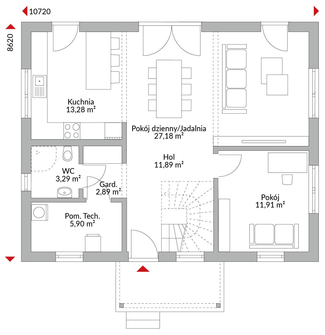 Parter domu Point 154.10 to serce Twojego domowego życia. Przestronny salon, połączony z jadalnią i sąsiadujący z otwartą kuchnią, tworzy jasną i przyjazną strefę idealną do wspólnego spędzania czasu. Kluczowym atutem tego projektu domu jest dodatkowa sypialnia zlokalizowana na parterze, oferująca wszechstronne możliwości – może służyć jako pokój gościnny, gabinet, lub komfortowa sypialnia dla domownika ceniącego wygodę bez schodów. Funkcjonalność parteru podkreślają również wygodna łazienka dla gości oraz niezbędne pomieszczenie techniczne.
