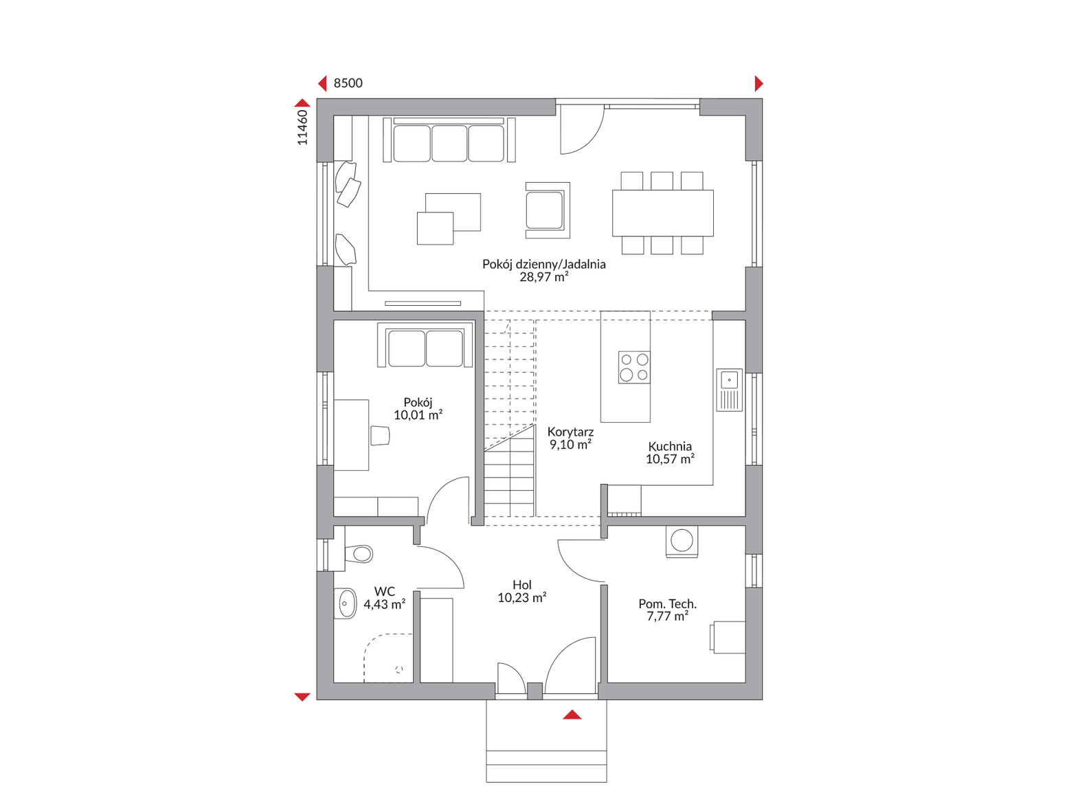 Parter domu Point 159 wita Cię przestronnym holem. Sercem domu jest jasna, otwarta kuchnia, która naturalnie łączy się z obszernym salonem i jadalnią, tworząc idealne miejsce do wspólnego życia, przyjmowania gości i celebrowania każdej chwili. Funkcjonalność tego poziomu podkreślają również wygodna łazienka dla gości oraz niezbędne pomieszczenie techniczne.