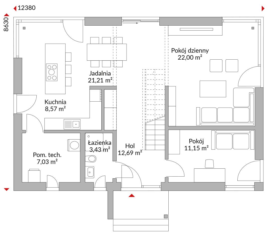 Dom półtorakondygnacyjny z zadaszonym wejściem i podwyższonymi drzwiami wejściowymi. Podwyższony parter z wyższymi oknami w części jadalnej tworzy otwartą dużą przestrzeń. Narożne przeszklenia w części jadalnej i salonie oraz drzwiami przesuwnymi prowadzącymi na taras i do ogrodu. Oddzielny pokój typu studio jako przestrzeń gościnna lub biuro, toaleta dla gości. Trzy sypialnie, garderoba dostępna z dwóch sypialni. Jedna sypialnia z łazienką i garderobą. Dodatkowa łazienka z prysznicem i schowek. Pomieszczenie techniczne, hol i korytarz. Dach dwuspadowy z szerokim okapem (60 cm), nachylenie 25°, ścianka kolankowa 2,00 m.