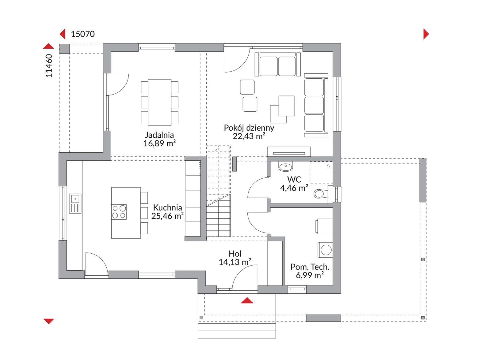 Parter domu Point 169.1 wita Cię przestronnym przedpokojem. Sercem domu jest jasna, otwarta kuchnia, która naturalnie łączy się z obszernym salonem i jadalnią, tworząc idealne miejsce do wspólnego życia i przyjmowania gości. Funkcjonalność tego poziomu podkreślają również wygodna toaleta dla gości oraz niezbędne pomieszczenie techniczne.