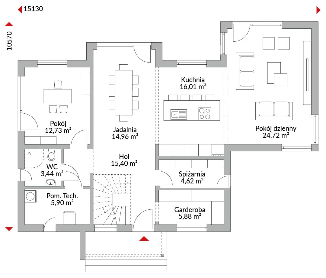 Parter domu Point 179 to serce rodzinnego życia – przestronny salon, płynnie połączony z jadalnią oraz otwartą kuchnią z praktyczną spiżarnią, tworzy niezwykle jasną i integrującą strefę dzienną. To tutaj będą tętnić życiem codzienne chwile i uroczyste spotkania. Wyjątkowym atutem tego poziomu jest dodatkowy pokój, idealny na gabinet, pokój gościnny lub sypialnię dla seniora. Funkcjonalność parteru podkreślają również wygodna toaleta oraz niezbędne pomieszczenie techniczne.