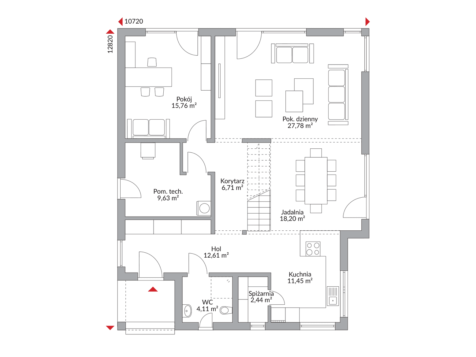 Poddasze użytkowe, dzięki optymalnej wysokości ścianki kolankowej, oferuje pełnowymiarową przestrzeń z aż sześcioma pokojami, które możesz zaaranżować według własnych potrzeb. Dwie komfortowe łazienki na obu kondygnacjach zapewniają wygodę wszystkim domownikom.