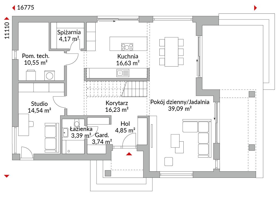 Dom półtorakondygnacyjny z zadaszonym wejściem i podwyższonymi drzwiami wejściowymi. Trzy pokoje na piętrze. Główna sypialnia z garderobą i łazienką en suite z podwójną umywalką, opcjonalnie z wolnostojącą wanną i prysznicem. Dodatkowa łazienka z prysznicem. Dwa pomieszczenia gospodarcze. Okna sięgające podłogi w formie szczytowych lub dwuspadowych. Na parterze oddzielny pokój typu studio. Podwyższony parter z pełnymi przeszkleniami od podłogi do sufitu jako otwarta kuchnia, salon i jadalnia z drzwiami przesuwnymi na taras. Spiżarnia, pomieszczenie techniczne, hol z garderobą, toaleta dla gości z prysznicem. Dach dwuspadowy z szerokim okapem (60 cm) od strony ogrodu, nachylenie 38°, ścianka kolankowa 1,50 m.